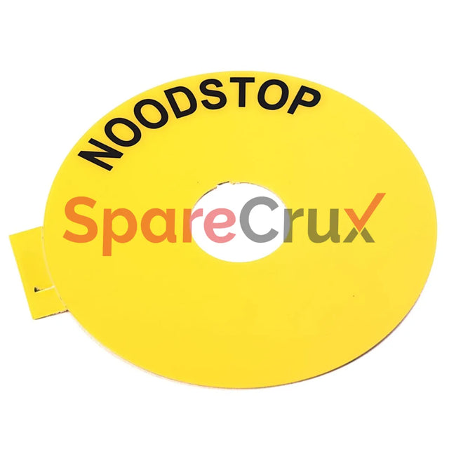 • Description: 90 mm Round Yellow Legend Plate with 'EMERGENCY STOP' Text
